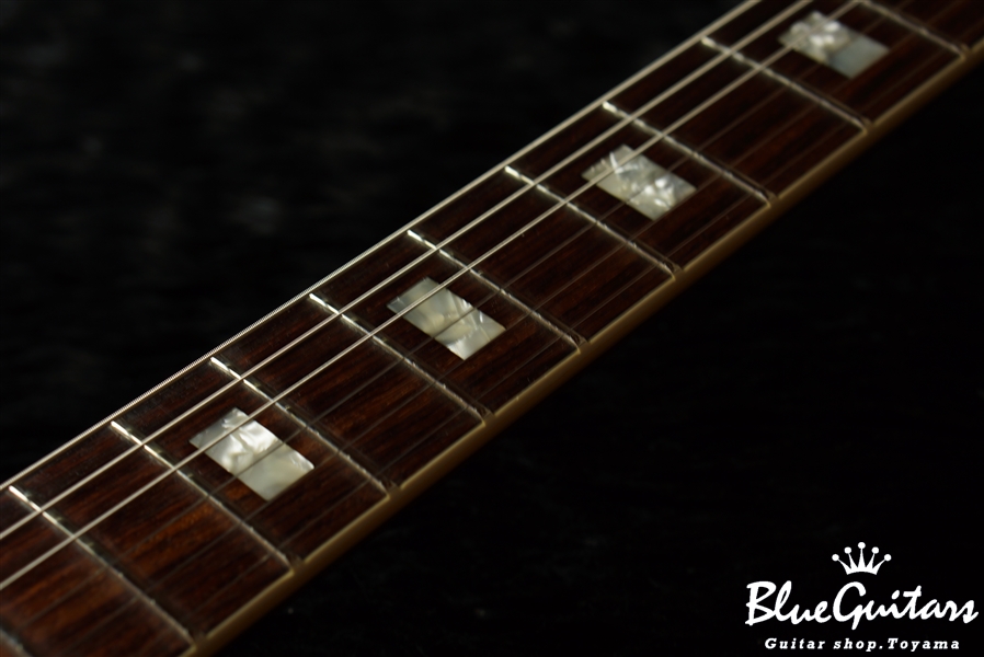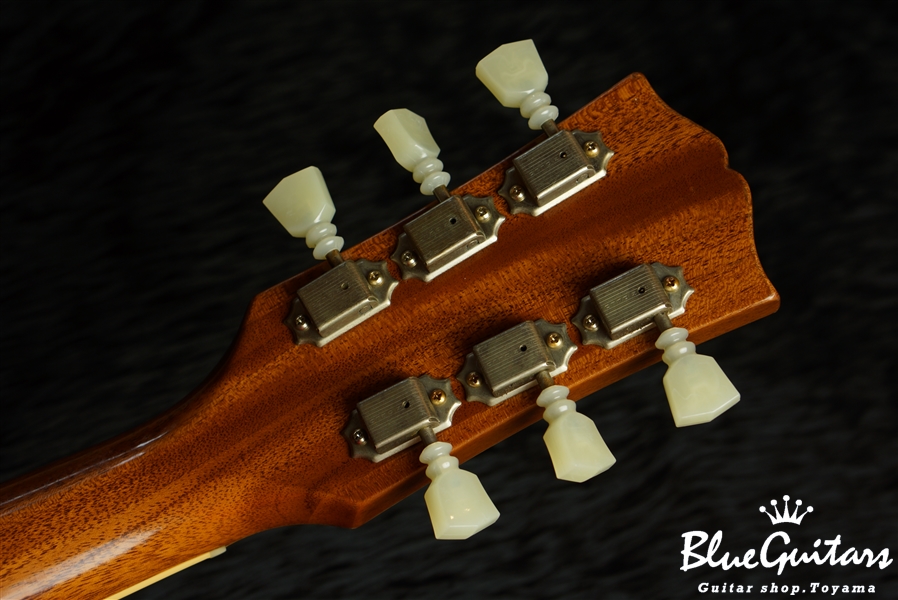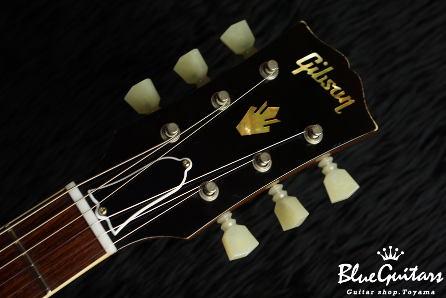 1959と異なり、ブロック・ポジションマーカー、ショート・ピックガード、ダブルリング・チューナーや、センターブロックは容積が小さい為、アタック感はやや穏やかでアコースティカルなニュアンスと倍音、箱感が強くなり、スムースで美しいクリーントーンをアウトプットします。